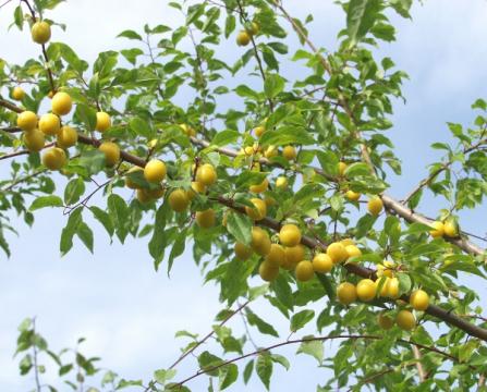 Frukten kan skördas i slutet av september, Kan eftermogna inomhus, Frukten är grön och när den är mogen är den gul, Behöver en annat plommonträd att korspollineras med
