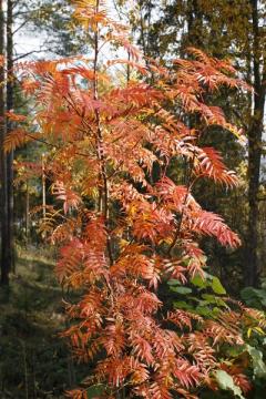 Mörkgröna blad med matt undersida, Röda vackra bär från sensommar, Vackert gårdsträd, rund bollformad