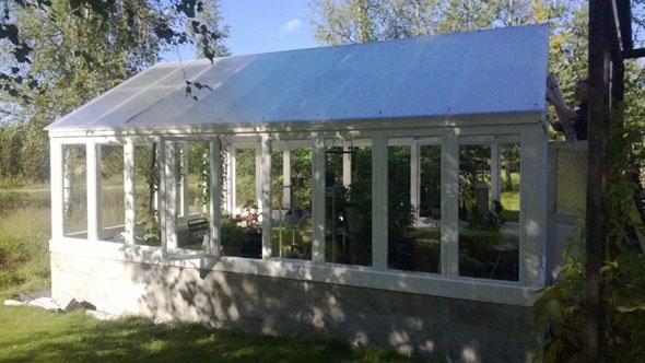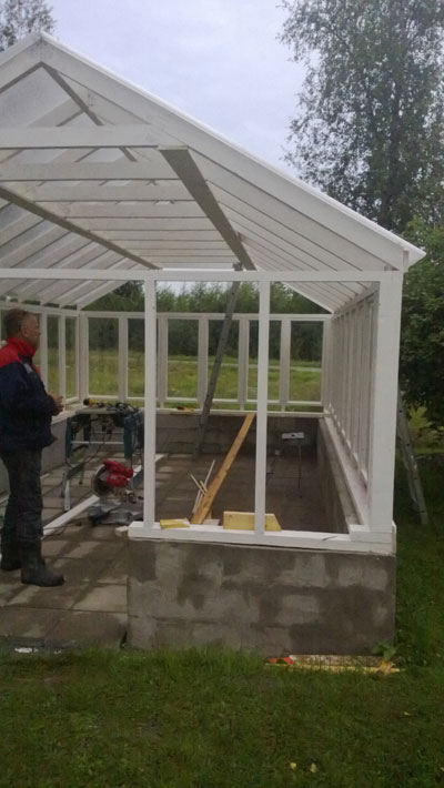 Ett bindvarv gjordes av 2x4 tums plankor och sedan spiror mellan fönstren av 2x2. Det var rätt mycket jobb att putsa de gamla fönstren och måla både dem och alla spiror. Vi använde vit målfärg (grönt och svart fanns också som alternativ). Takstolarna köptes färdiga, egentligen ämnade för minkhus, men de passade perfekt när vi sågade bort 30 cm vid båda ändarna. Vi är speciellt nöjda med att vi köpte dem färdiga, för det underlättade mycket. Kostnadsmässigt blev det heller inte dyrare, snarare tvärtom.
